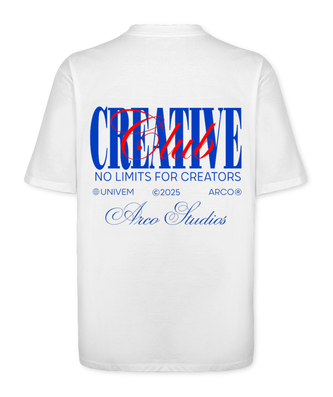 A Camiseta Oversized ARCO Creative Club representa o espÃrito de quem transforma ideias em movimento. Feita em 100% algodão fio 30, com gola canelada 2x1 e modelagem quadrada super oversized, une conforto, estilo e autenticidade. Os tons de azul simbolizam confiança, nobreza e o senso de comunidade criativa que move a ARCO — uma collab com a UNIVEM, onde o design e a criatividade se encontram. Mais do que uma peça, é um manifesto: não existe limite pra quem cria.